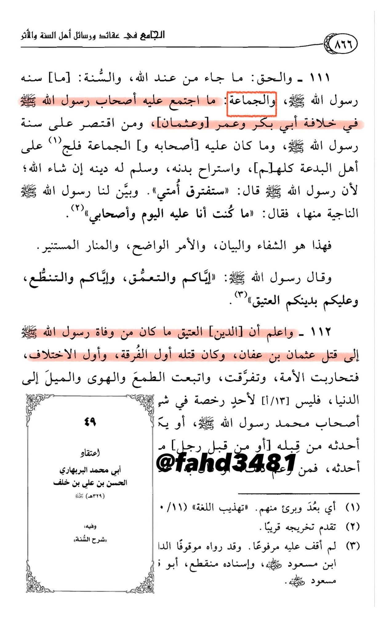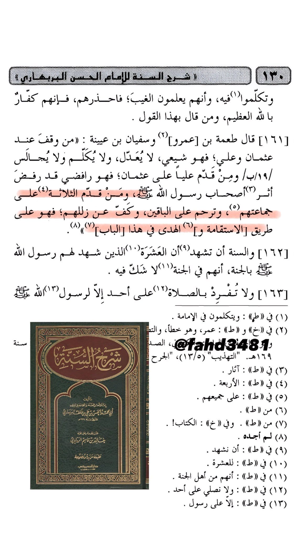 شيخ الحنابة و امام السلف البربهاري يعتقد بعدم صحة خلافة علي بن ابي طالب .