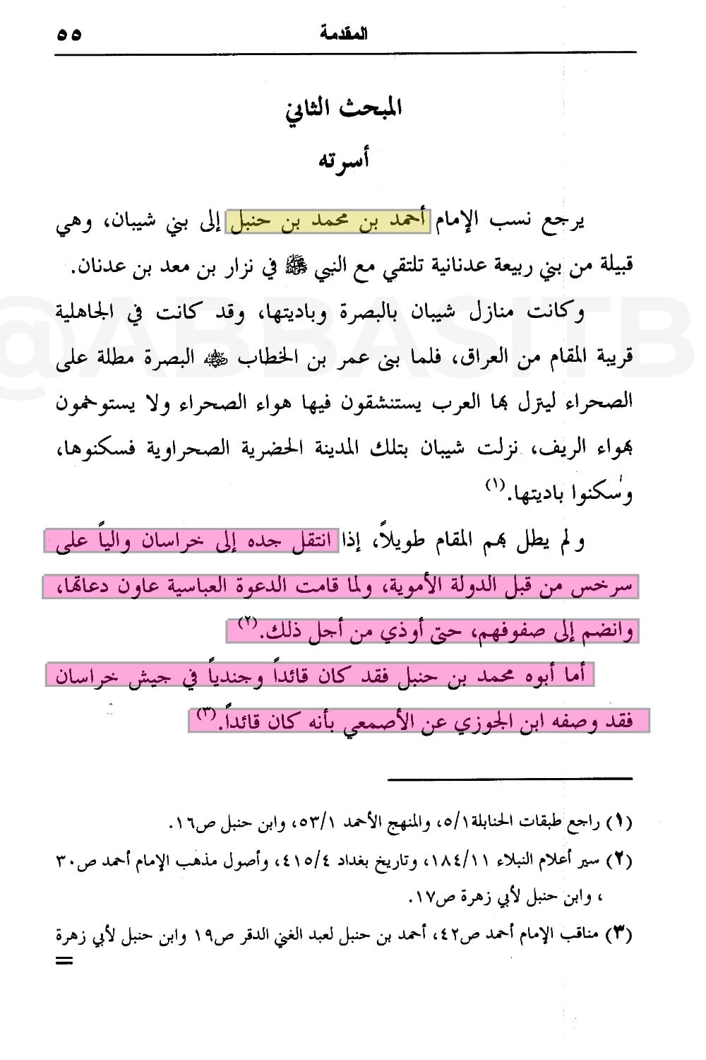 * ما سبق من باب المعلومة التاريخية لأخذ فكرة عن جو أسرة أحمد بن حنبل ومحيطه والبيئة التي نشأ بها -وليس المراد الطعن بشخصه- فمن الضروري معرفة ذلك لأن الجو المحيط يؤثر مباشرةً بطبيعة الحال بشكل أو بآخر في البناء المعرفي والثقافي والمذهبي لأي شخص وذلك يعيننا في تفسير الكثير من المواقف والتساؤلات حول هذه الشخصية