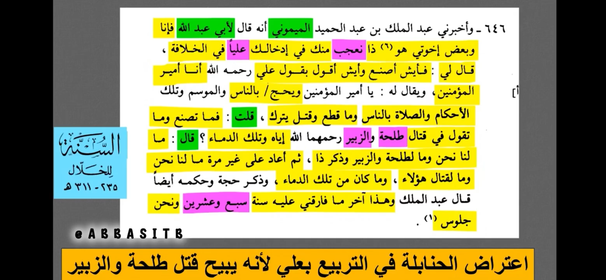 هذا أول مسمار دقه أحمد بن حنبل في نعش المسلمين وشرَّع للروافض التعدّي على الصحابة وتكفيرهم واستباحة قتلهم وشتمهم بأنهم بغاة وعصاة وناكثين وقطاع طرق حاشاهم رضي الله عنهم