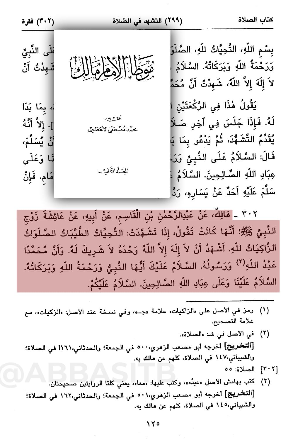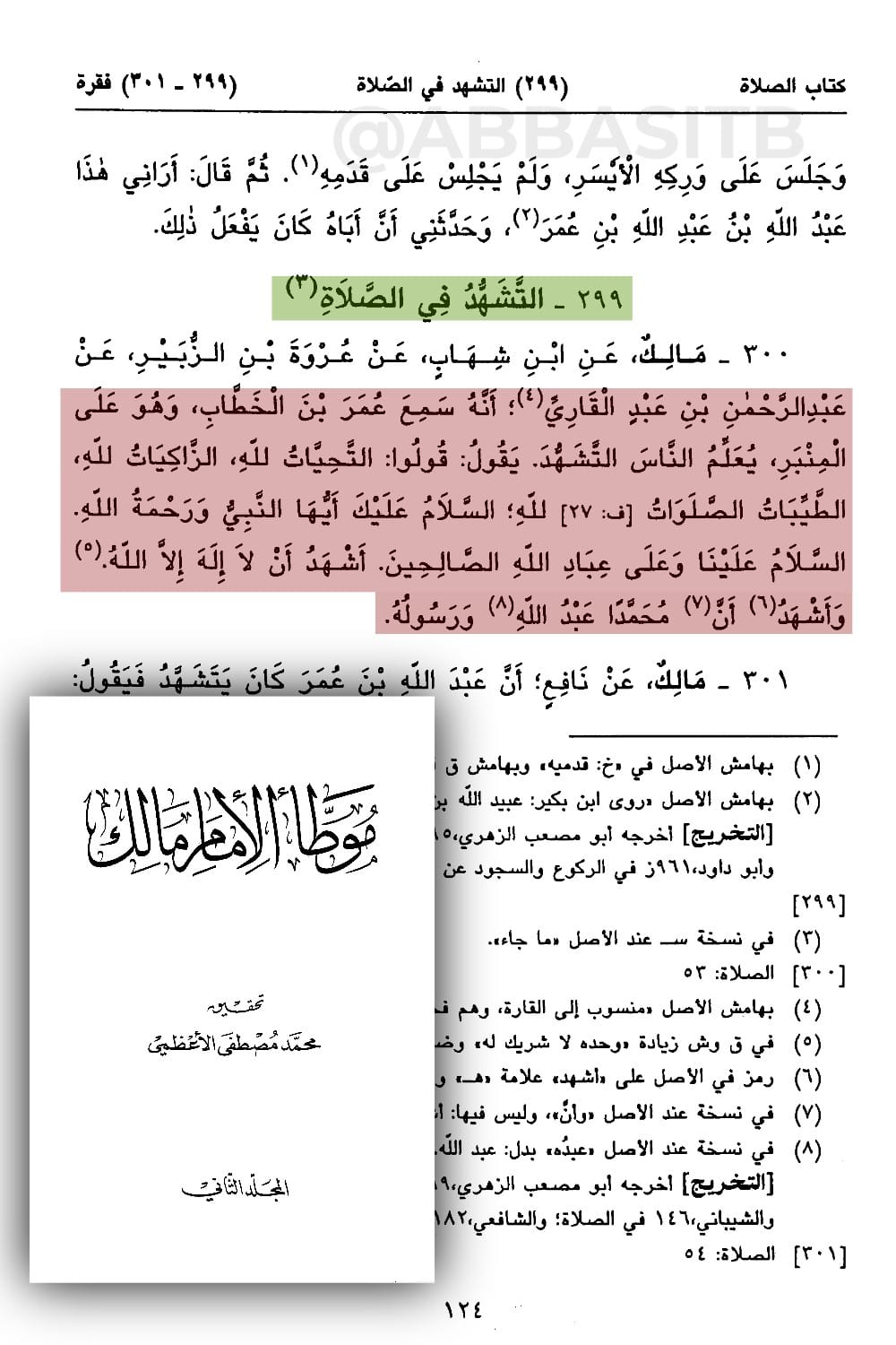 الإمام مالك بن أنس ينقل لنا بإسناد ذهبي عن فقيه الصحابة عبد الله بن عمر بن الخطاب صيغة التشهد "في الصلاة"]: