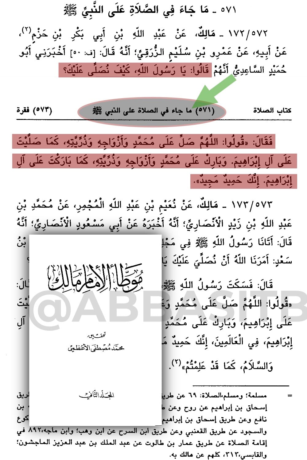 2- [ الصلاة على النبي ] عليه الصلاة والسلام، وهي كيفية الصلاة عليه بشكل عام "وليس في الصلاة" وهنا أورَدَ مالك صيغ متنوعة في الصلاة على النبي تحت باب (ما جاء في الصلاة على النبي)، ومن هذه الصيغ: